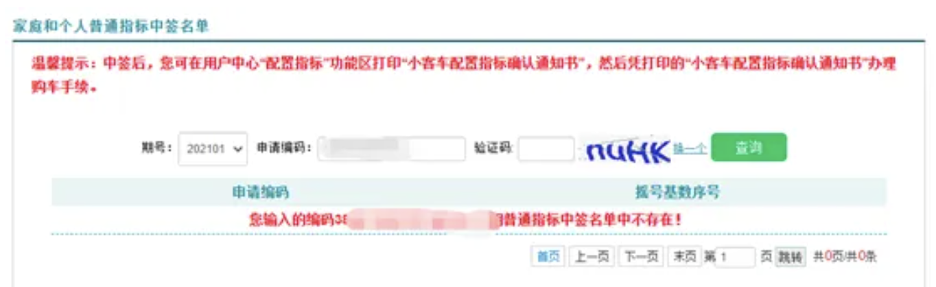 第三步:勾選查詢的期號,例如202101代表查詢2021年第一期小客車指標申請搖號結果,大家可以輸入申請編碼后,點擊【查詢】按鈕,結果會直接在頁面中呈現