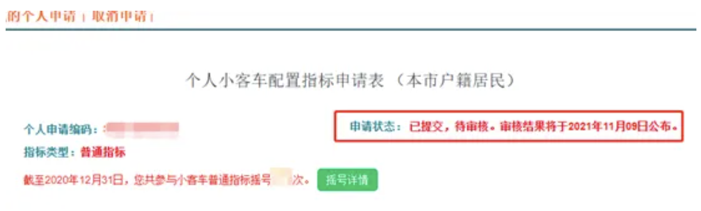 第二步:進入用戶中心后,在配置指標中,可以看到有【我的個人申請】和【我的家庭申請】,這里以個人申請舉例。點擊【我的個人申請】按鈕,進入個人小客車配置指標申請表結果頁面