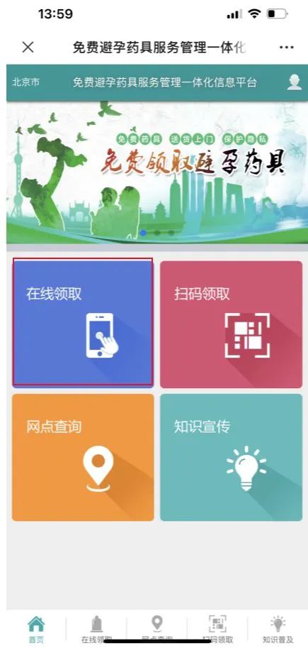第二步:在“免費避孕藥具服務管理一體化信息平臺”中,點擊“在線領取”按鈕。