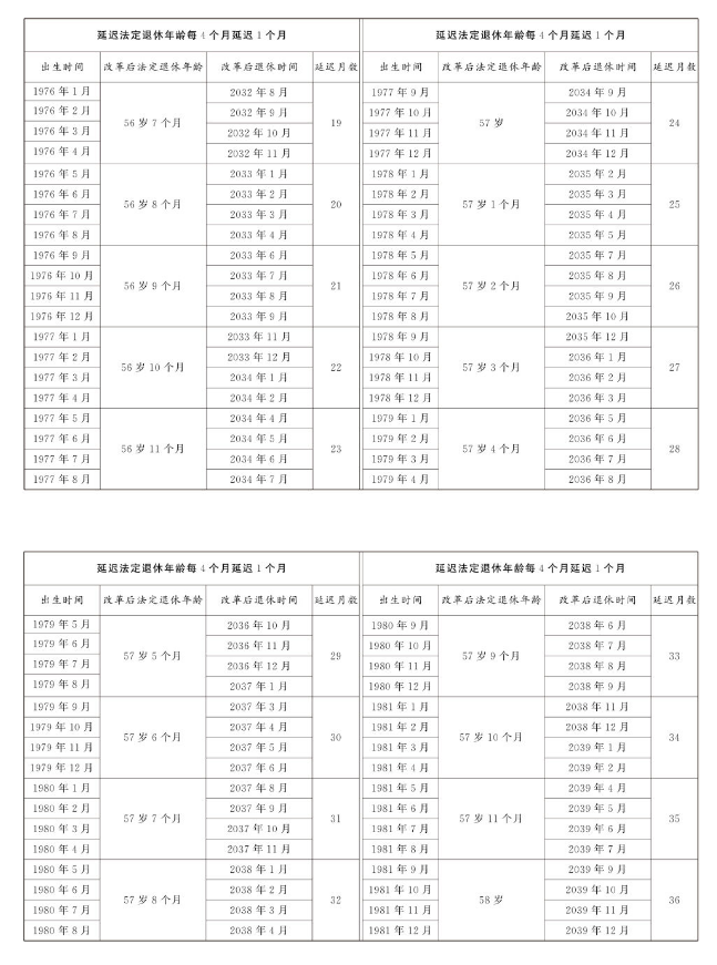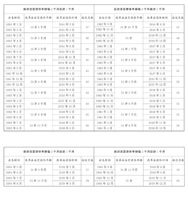 第一條?從2025年1月1日起,男職工和原法定退休年齡為五十五周歲的女職工,法定退休年齡每四個(gè)月延遲一個(gè)月,分別逐步延遲至六十三周歲和五十八周歲;原法定退休年齡為五十周歲的女職工,法定退休年齡每二個(gè)月延遲一個(gè)月,逐步延遲至五十五周歲。國家另有規(guī)定的,從其規(guī)定。