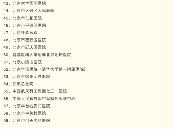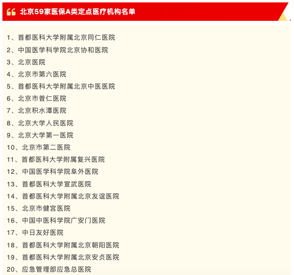 1)截止目前,北京共有59家A類定點醫(yī)院,可以不用選直接報銷。